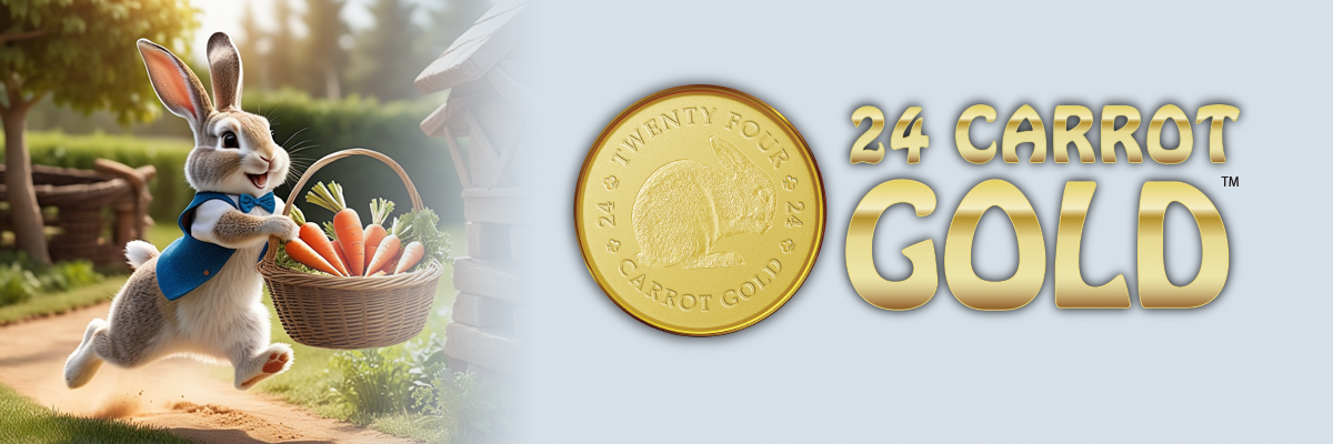24 Carrot Gold™ is a ‘hare-raising’ garden adventure. This kid-friendly game captivates the whole familiy; challenging each player to make sense of the other player’s move. It’s fast paced fun and a great way to learn valuable math, deduction and memory skills. The game board is your farm where eight eager rabbits gather carrots from twelve different gardens. Fill a basket with 24, throw them in the magic well, and a gold coin - a 24 carrot gold coin - magically appears in your hand. But, you better be quick, other players are on your tail. You’ll need your wits, wisdom and little bit of luck to fill your pockets with gold. Twenty-four carrot gold.